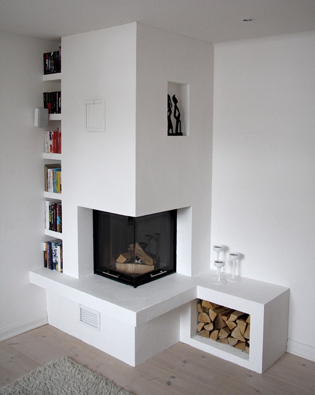 Hörnspis med liten bänk / vedförvaring på ena sidan samt att vi drog fram den något för att få till en liten bokhylla på andra sidan. Insatsen är från Spartherm.