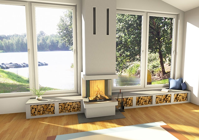 Denna u-formade insats från Spartherm har långa sidoglas och fungerar perfekt som rumsavdelare eller om man oftas ser elden från sidorna. Hisslucka för enkelt handhavande när man skall lägga in veden och för optimal insyn.