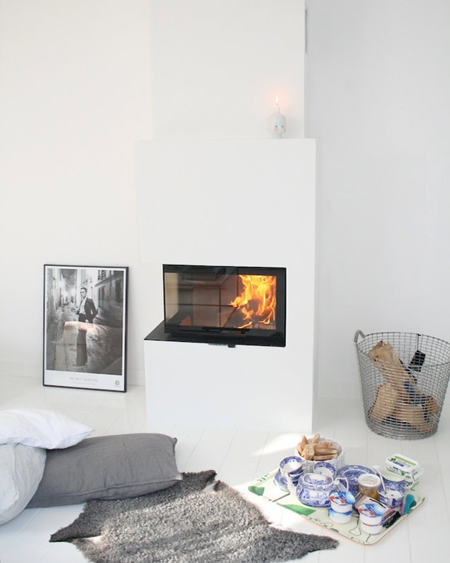 Denna spis med insats från Contura passade perfekt i hörnet och gav utrymme för ett vedfack på sidan. En elegant stenhylla och svart plåt på golvet ramar in eldstaden på ett elegant sätt.